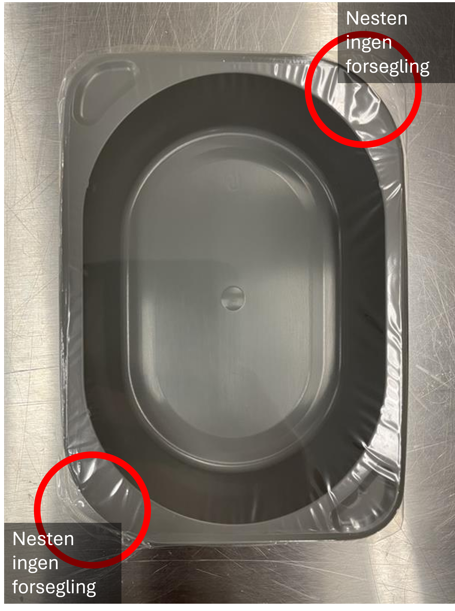 For begge formsettene ble det oppnådd tilfredsstillende forsegling langs sidene av skålen. Det ble imidlertid observert gjennomgående svikt i to motstående hjørner, hvor forseglingen var ufullstendig eller manglende. Dette vurderes å skyldes utilstrekkelig geometrisk tilpasning mellom formsett og skål.